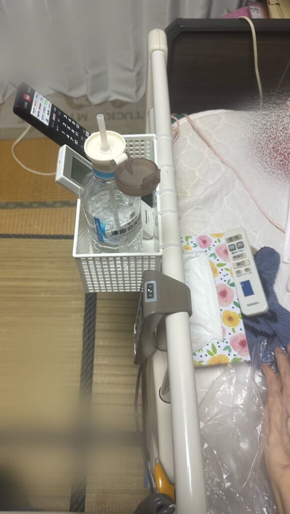 そこで、私たちはベッドの柵に小さな籠(かご)を取り付け、水分をすぐ手の届く場所に置けるようにしてみました。使ったのはすべて100円ショップで購入できるものばかり。軽くて通気性のある小さめのプラスチック籠と、固定用にはご自宅にあった「インシュロック」(結束バンド)を活用しました。