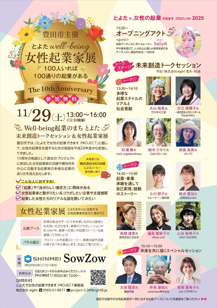 このイベントは、平成28年度から豊田市が主催する女性の起業支援プロジェクト「とよたで女性の起業できます.PROJECT」の一環としてスタートしました。豊田商工会議所や豊田信用金庫と連携し、女性が一歩を踏み出すための支援を続けてきたこの取り組みは、今年で10年目を迎えました。